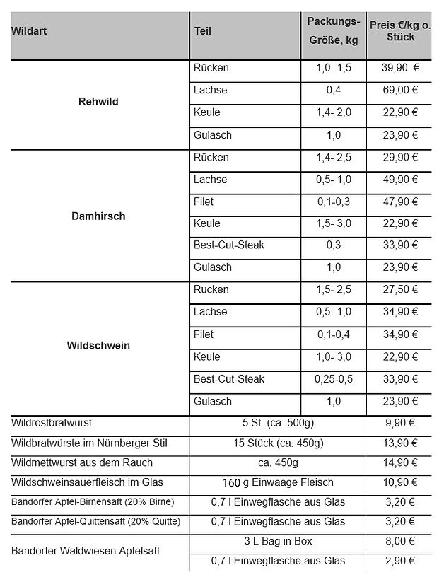 + Sie besuchen unseren Wildverkaufsstand auf dem Bliestorfer Winterzauber an den Adventswochenden, ab dem 6.12.2025, geöffnet von 10- 17 Uhr. Hier können Sie Ihr Wildfleisch entweder aus der Theke aussuchen oder Ihre Bestellung abholen. Da wir dort nur eine begrenzte Lagerkapazität haben, empfehlen wir vorzubestellen, Sie können sich am Ende immer noch umentscheiden!